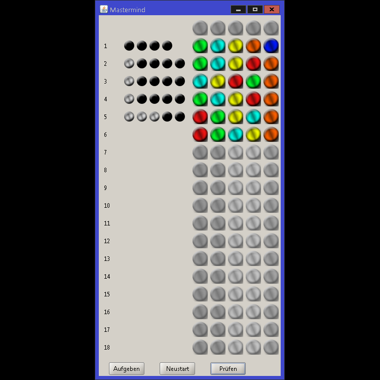 "Mastermind entstand in Rahmen einer Projektübung in der Berufschule. Aufgabe war die Umsetzung eines simplen Spiels in Java. Neben einem Grafiker, waren außer mir noch ein GUI-Entwickler und ein zweiter Spiellogik-Programmierer eingesetzt. Das Spiel wurde zu unserer vollen Zufriedenheit fertiggestellt."