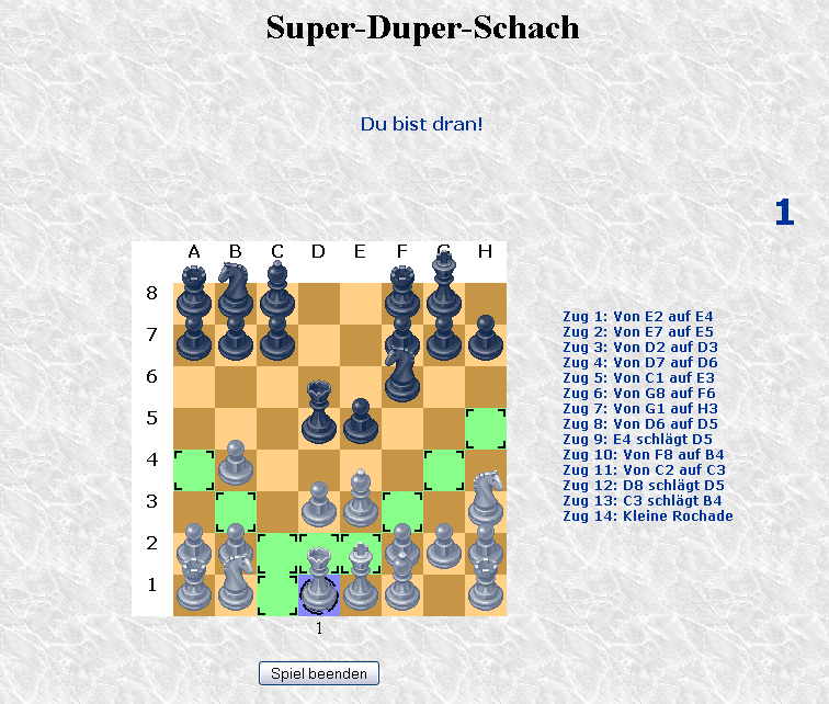 "Nachdem ein Mitauszubildender Programmierer das Grundgerüst für ein Schachspiel mit JavaScript entwickelt hatte, verlor er das Interesse daran und ich übernahm die Weiterentwicklung nach meinen Vorstellungen. Ich stellte die Grundfunktionen fertig und programmierte die Kommunikation der Spieler über AJAX Requests aus. Abschließend stellte ich das Spiel bis zu den Endphasen Matt und Remi fertig."