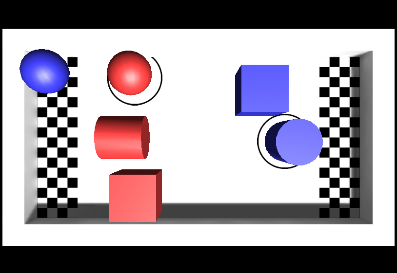 Spielkonzept: Zwei Spieler treten mit einfachen, geometrischen Figuren gegen einander an. Die Spieler stoßen ihre Figuren gleichzeitig über das Spielfeld und versuchen, den eigenen Würfel in die gegnerische Endzone zu bewegen. Gedanklich lehnt das Spiel ein einen Kasten mit Bauklötzen an.